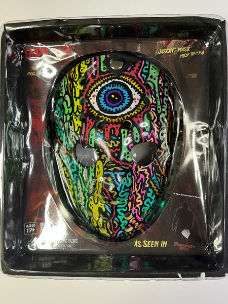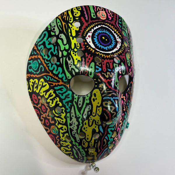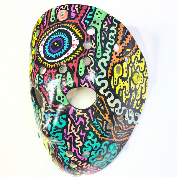 One of one hand painted Jason replica mask made with acrylics and spray sealed. Signed on the back. Straps attached with snaps.