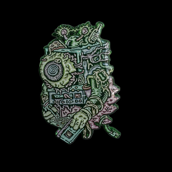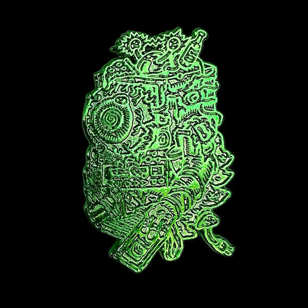 Gunky is two inches and shines in an epoxy coating. The metal is green anodized and on the back you'll find that it is double posted, numbered and name stamped. The Pearlescent Gunkmeister is also limited to 5 pieces.