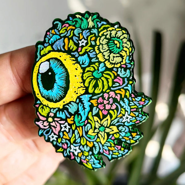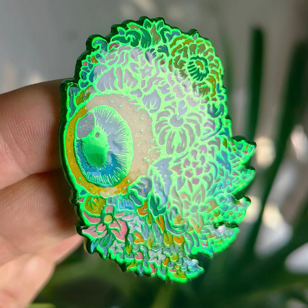 This two inch pin features green anodized metal, epoxy coating and glitter.